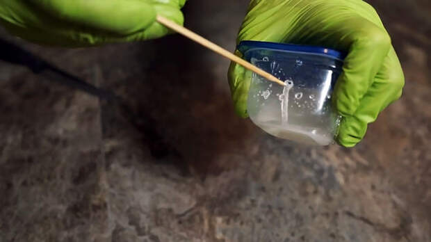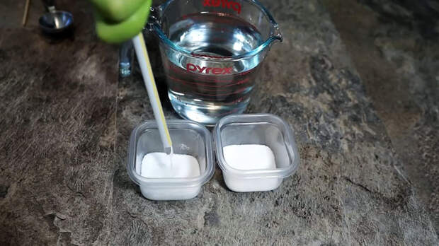 Добавьте воду, лучше это делать соломинкой, она позволяет точно контролировать количество и по мере необходимости добавлять еще. Состав по консистенции должен напоминать густой сахарный сироп.