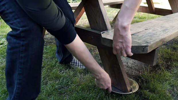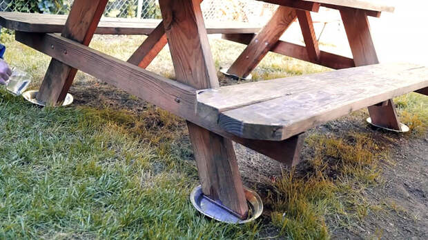 На пикнике муравьи попадают на стол по ножкам, надо им отрезать этот путь. Воспользуйтесь глубокими одноразовыми тарелками или иной пластиковой тарой, подходящего под ножки диаметра. Подложите их под стол и налейте воду. Такая элементарная защита работает очень эффективно.
