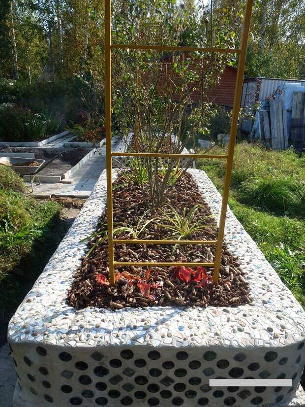 Теперь у меня таких клумб 4 штуки, с различной мозаикой. В ход пошло все: и битая плитка, и остатки камешков, и все что под руку попадалось.