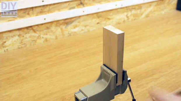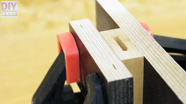 Для того чтобы избежать появления сколов и расщепления плашки, аккуратно зажимаем её между двух деревянных брусков с помощью струбцин. В таком виде производим фрезерование по предварительно сделанной разметке.
