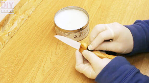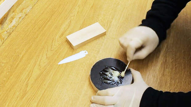 Плашку с готовой прорезью освобождаем от струбцин и закрепляем лезвие. Для этого заполняем клеем прорезь и вставляем в неё наше лезвие.
