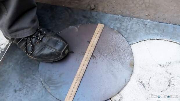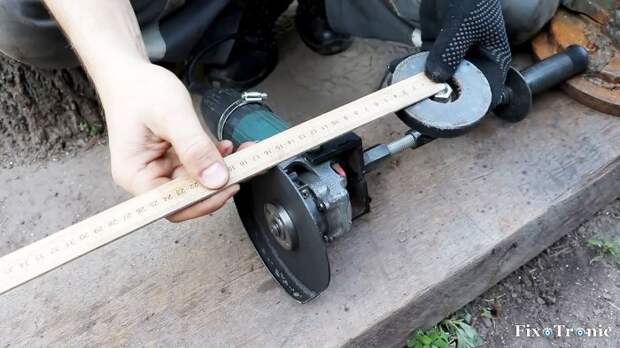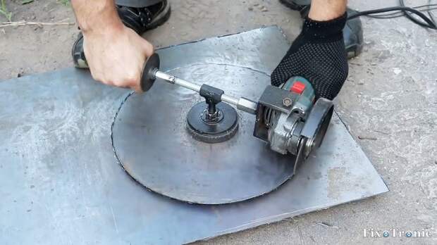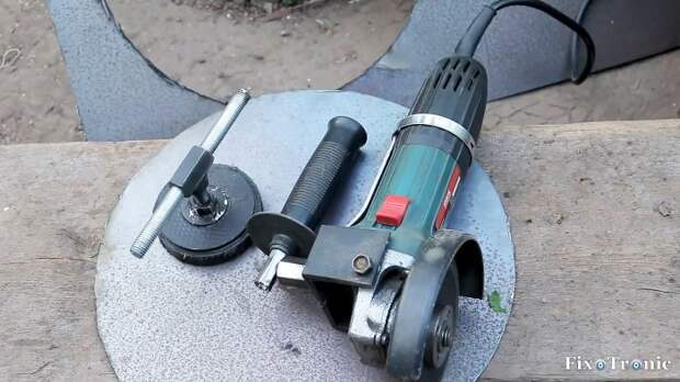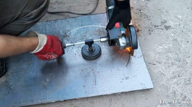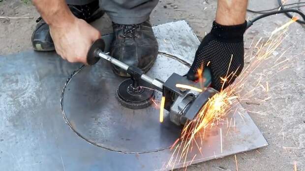 Оно будет равно радиусу круга, который мы собираемся вырезать в листовом металле, если узел с магнитом установить в центр вырезаемого круга, а болгарку с диском перемещать за ручку по заданному радиусу, прижимая инструмент к металлу.