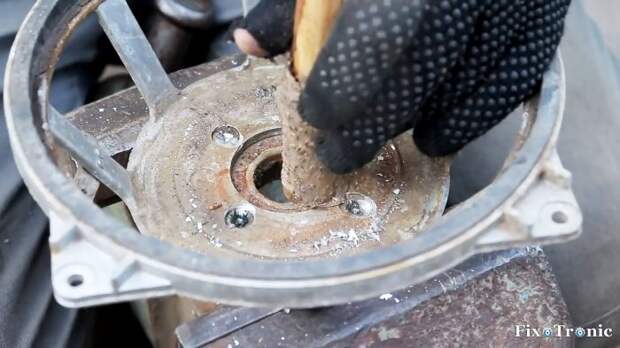 Зажимаем его за фланцы и магнит в тиски и высверливаем головки винтов, которыми корзина прикручена к верхнему фланцу. Отделяем корзину с верхним фланцем от постоянного кольцевого магнита и нижнего фланца со стальным цилиндром (керном). Снова зажимаем в тиски корзину с верхним фланцем и с помощью молотка и наставки выбиваем фланец из корзины.