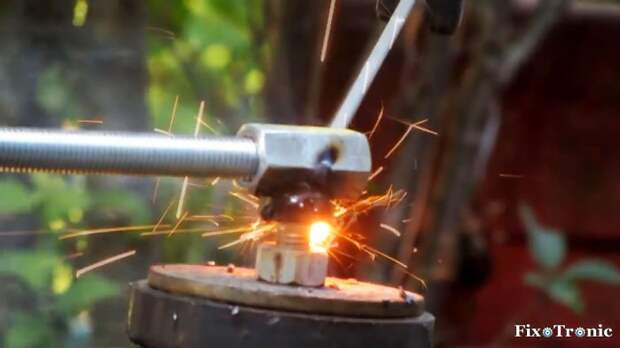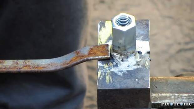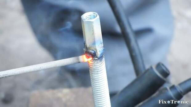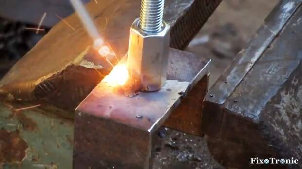 Поверх головки болта располагаем удлиненную шестигранную гайку и привариваем ее в таком положении.