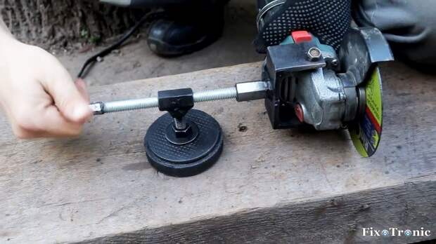 Вращая узел с постоянным магнитом вокруг шпильки, можно увеличивать или уменьшать расстояние между центром гайки (осью вращения) и диском болгарки.