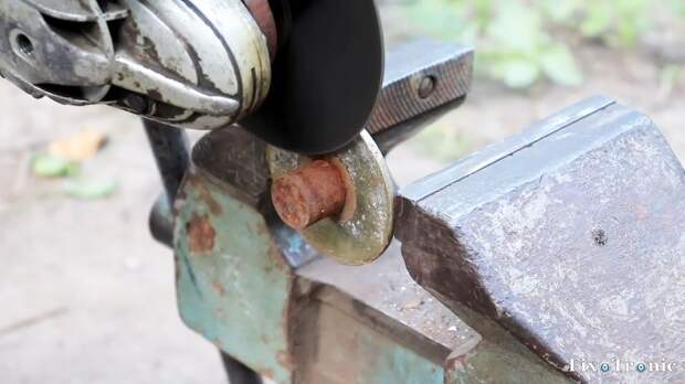 Зажимаем нижний фланец в тиски и болгаркой отрезаем керн у самого основания.