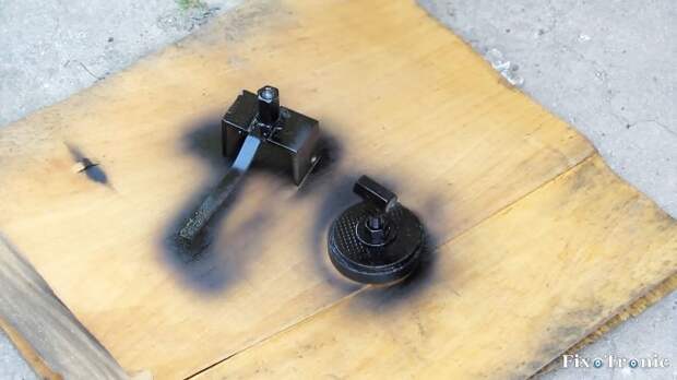 Узлы из двух сваренных уголков, удлиненной гайки и фигурной ручки, а также постоянного магнита, фланца, болта с гайкой и шайбой и, приваренной удлиненной гайки к головке болта, окрашиваем черной аэрозольной краской из баллончика.