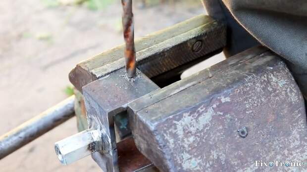 Зажимаем конструкцию из двух уголков и гайки в тиски и на полках внизу ближе к боковой стороне сверлим отверстия напротив друг друга, охлаждая место сверления водой.